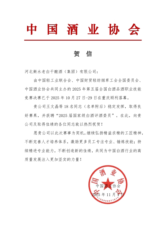 中国酒业协会发来贺信,在恭祝企业取得良好成绩的同时,希望以此次赛事为契机,继续弘扬精益求精的工匠精神,不断完善企业人才培育体系,持续增进业务能力。